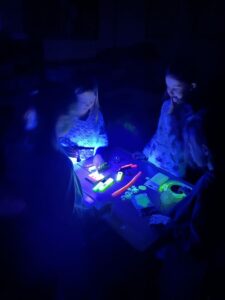 Welche Dinge fluoreszieren bei Schwarzlicht? Welche leuchten noch nach? Bei dieser spannenden Einheit der unverbindlichen Übung MINT Werkstatt setzten sich die Kinder mit Licht auseinander. Schließlich wurden Bilder mit fluoreszierenden Farben gemalt – es entstanden spannende Werke!